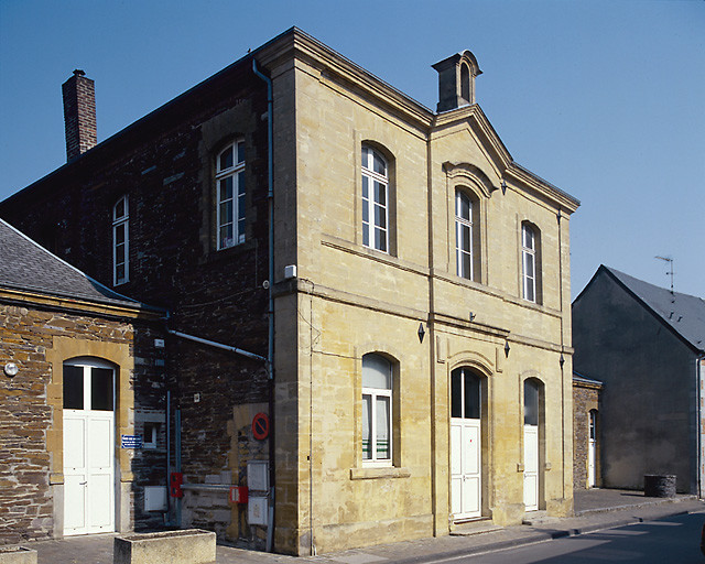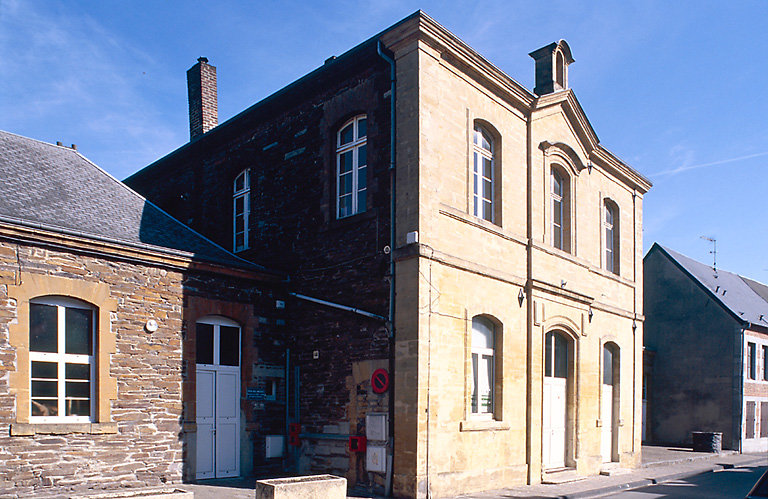 Deux anciens préaux, sans étage et appareillés en moellon de schiste, encadrent la section principale de l'édifice qui comprend, à l'origine, les salles de classe. Cette section, à un étage, présente une façade appareillée en calcaire de Dom. Des frontons surmontant les ouvertures et un clocheton mettent en valeur la travée centrale de l'édifice où se situait l'entrée principale. Le toit, en ardoise, présente une couverture à longs pans et à croupe.