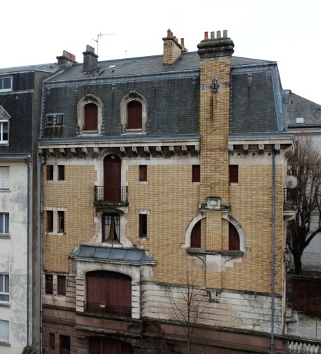 En façade sur la rue, la demeure est discrète malgré la qualité de sa mise en oeuvre. L'élévation arrière est rendue plus imposante par un niveau de soubassement nécessaire pour asseoir la maison sur un important dénivelé. La variété des matériaux est le premier ornement de cette maison : grès rose du soubassement, calcaire blanc du rez-de-chaussée, à l'appareil souligné par un bossage, puis brique claire des élévations, où les ouvertures se signalent par leurs encadrements en calcaire et enfin ardoises du niveau de comble surhaussé sur lesquelles tranchent les encadrements des lucarnes. Le niveau de soubassement et le rez-de-chaussée aux appareils traités en bossages s'inscrivent dans la tradition néo-classique. Sur l'élévation arrière, un balcon couvert en débord davantage inspiré des oriels du 19e siècle que proche des bow-windows à venir, marque le rez-de-chaussée. La sculpture végétale rehausse le tympan de la porte sur la rue et les consoles qui portent les balcons et le débord du toit, des cabochons en céramique colorée ornent les métopes de la frise qui porte l'avant-toit dont la corniche est soulignée par un rang d'oves et rais-de-coeurs. Les courbes des balcons en pierre, le décor sculpté, les arcs couvrant les fenêtres inscrivent bien cette architecture dans l'Art nouveau, mais ici sans excès d'ornement, rejoingnant en cela l'inflexion que connaît l'Art nouveau, dit aussi modern style, dans les années 1920. Le décor est ici cantonné aux cadres, subordonné à la structure qu'il souligne, la distribution des ouvertures est le reflet de l'organisation intérieure.