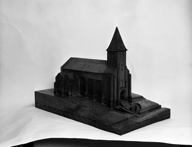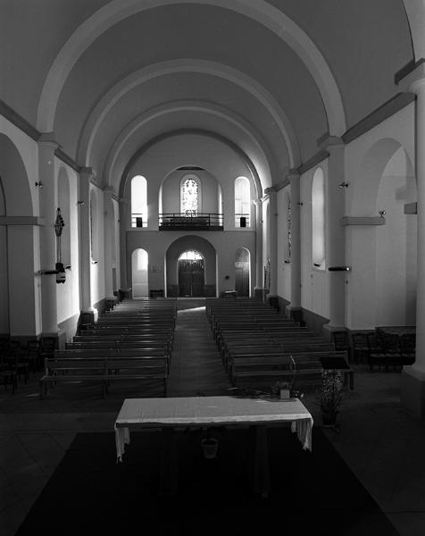 La base des murs et le massif occidental sont en moellons de grès, le reste de l'édifice est recouvert d'un enduit imitant un appareil régulier ; l'abside voûtée en cul-de-four est couverte d'une croupe ronde ; la nef est voûtée en berceau ; les chapelles sont voûtées d'arêtes ; le clocher est couvert d'une flèche conique ; un escalier relie la rue à l'entrée principale de l'église