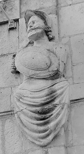 Sujet : fronton triangulaire interrompu par un édicule couronné d'un fronton cintré et contenant un blason nu entouré de cuirs, vases contenant des fleurs, support : portail de la cour ; sujet : fronton triangulaire, deux bustes de guerriers engainés, support : portail du jardin ; sujet : merlons, support : mur de clôture sur rue du jardin ; sujet : corniche à modillons écrasés, support : façade postérieure.