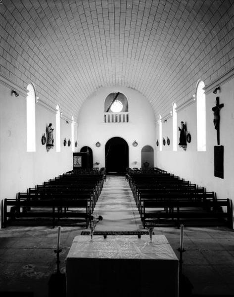 Contreforts et bases des chaînes d'angle en grès. Chaînage, encadrement des ouvertures (porte et fenêtres) , corniche et modillons en calcaire. Nef et chapelles latérales couvertes d'une fausse voûte en berceau plein cintre en plâtre à décor pierre. Arc triomphal reposant sur 2 colonnes engagées à chapiteaux corinthiens.
