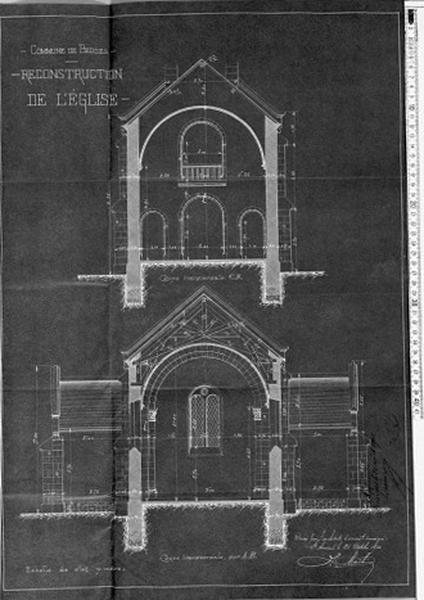 Eglise construite au 12e siècle. Choeur reconstruit au 15e siècle. En ruine à la fin du 19e siècle, l'église est reconstruite au même emplacement en 1901 par l'architecte d'arrondissement Isidore Martin.