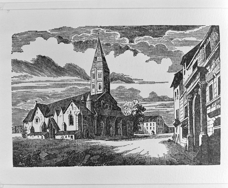 D'après Gandelot et Courtépée, l'église ne fut achevée qu'en 1098 ; on employa à sa construction les matériaux du castrum gallo-romain et du temple de Bélénus ce qui expliquerait les figures antiques et les inscriptions que l'on voyait sur les piliers. Après les incendies de 1272 et 1401, elle fut considérablement remaniée et augmentée : agrandissement des fenêtres, construction de nouvelles chapelles notamment du côté du collatéral droit, construction, en 1501, d'un nouveau porche qui ne fut jamais terminé. L'église fut détruite de 1803 à 1805.