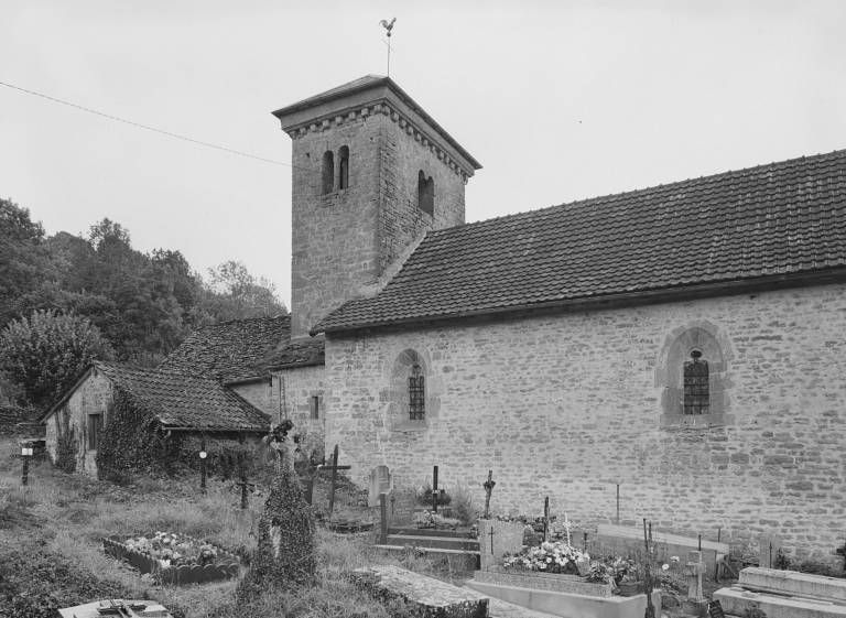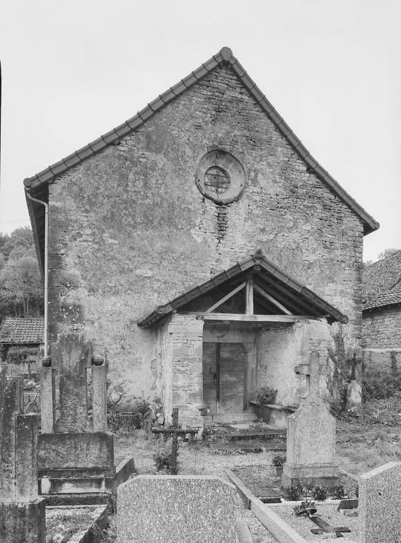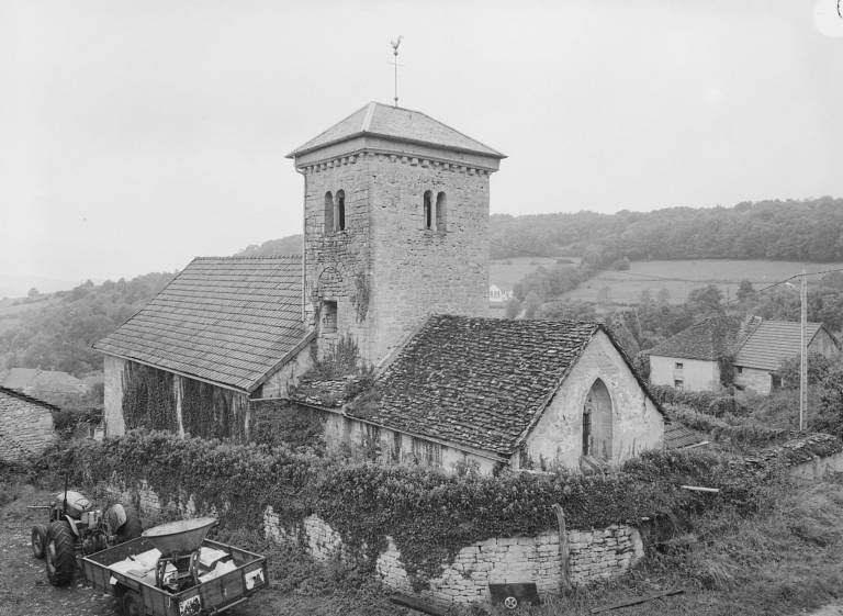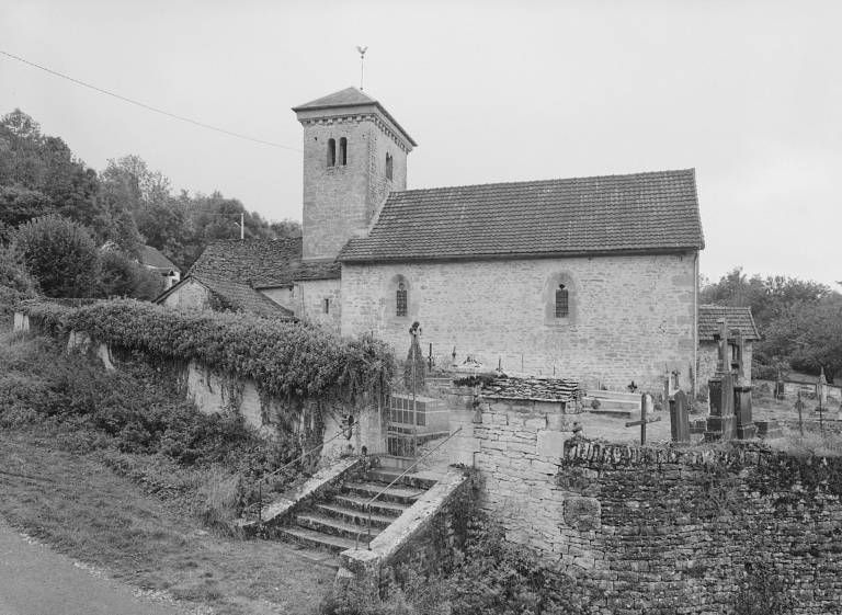 Située en hauteur à l'extrémité est du village, dans l'enclos du cimetière, l'église est bâtie sur un terrain en déclivité est-ouest ; choeur et sacristie sont en partie enterrés. Un porche de plan trapézoïdal, à banquettes de pierre latérales, précède le portail de la nef, à tympan sur coussinets, surmonté au pignon d'un oculus à ébrasement concave. La nef est couverte d'une fausse voûte en berceau qui laisse apparents les quatre entraits de la charpente, de section octogonale ; elle est éclairée par quatre fenêtres en arc brisé à ébrasement intérieur concave et remplage trilobé ; dans le mur sud se trouve un lavabo orné d'un arc en accolade. Moins large, la travée d'avant-choeur, sous clocher, est limitée par deux arcades brisées à impostes et couverte d'une voûte en berceau brisé ; le mur nord est percé d'un jour en archère à encadrement chanfreiné. Le choeur à chevet plat, plus étroit, est voûté également en berceau brisé ; une fenêtre en plein-cintre, étroite et ébrasée, est ouverte dans les murs latéraux, la fenêtre gauche étant occultée par la sacristie accotée au mur nord du choeur ; le mur du chevet comporte une baie plus large en arc brisé (remplage refait) et ébrasement extérieur concave. La sacristie, dont la porte est dissimulée par le lambris, est couverte d'une voûte en berceau plein-cintre transversal et éclairée par une fenêtre rectangulaire au mur-pignon. L'accès au clocher se fait par un escalier extérieur parallèle au mur sud de l'avant-choeur. La tour du clocher, de plan rectangulaire, est percée sur ses quatre faces de baies jumelées en plein-cintre dont les arcs reposent au centre sur deux colonnettes de section octogonale (celles de la baie ouest ont disparu) ; les murs sont couronnés d'une corniche à modillons ; on voit dans le mur sud une porte haute sous un arc en plein-cintre muré. La couverture du porche, de la nef et de la sacristie est en tuile mécanique, celle du choeur en pierre plate ; le toit en pavillon du clocher est couvert d'ardoise.