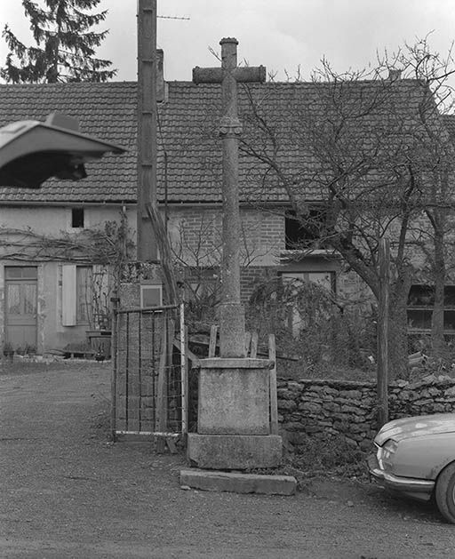 La croix porte, gravée sur la face antérieure du dé du fût, l'inscription : A LA / dévotion / des époux / P.re / BONNAND / et anne / DUMAY / 1845.