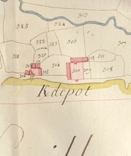 cour ; mur de clôture ; portail ; étable à vaches ; étable à chevaux
