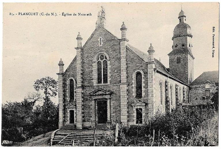 La légende de la croix Un artisan en maçonnerie ayant besoin d'eau pour un chantier charge ses employés d'aller récurer la fontaine Ruellan du champ des Rochettes. Ceux-ci découvrent trois morceaux de granite taillés provenant d'une croix brisée ancienne. Selon l'abbé Blanchet, les morceaux sont réunis et réinstallés sur leur socle au sommet de la fontaine. Sur une face, une représentation de la Vierge à l'Enfant et sur l'autre, le Christ en croix. Quelques semaines plus tard, un simple d'esprit, Gilles Portier la jette à nouveau dans la fontaine. Des habitants tentent de retrouver les morceaux, en vain. Dès lors, des manifestations étranges apparaissent de la fontaine : des lueurs éclatantes en pleine nuit émergeant de l'eau et des lamentations. En 1644, afin de mettre fin à ses manifestations et aux commérages, les trois frères Faguet décident de sonder la fontaine pour retrouver la croix brisée. Elle est à nouveau assemblée et réinstallée sur son socle. La population ne tarde pas à venir vénérer la statue de la Vierge et les premiers miracles à se manifester. Un marchand de la rue de l'Abbaye, Guillaume Huet, était alité depuis la Pentecôte et ne pouvait plus se lever depuis septembre. Il pria la Vierge le jour de sa redécouverte et promis de se rendre à la fontaine s'il pouvait remarcher. Instantanément, les douleurs se dissipèrent et il put remarcher. Le lendemain, en revenant de Dinan à pied, il décida, avec les frères Faguet de construire un oratoire (une petite cabane en bois) afin de recueillir les ex-voto et garder la statue. Un autre exemple de guérison miraculeuse : George Noday, avocat royal, juge et officier de plusieurs juridictions souffrait de surdité depuis plus de deux ans. Suite à son voyage à Plancoët et à sa dévotion à la Vierge, il entendit à nouveau.L'installation des Dominicains à Nazareth Suite à l'enquête menée pendant 3 jours de novembre 1644 (copie à voir en voir lien web), ordonnée par Mgs Achille de Harlay de Sancy, évêque de Saint-Malo, la découverte et ses manifestations sont déclarées divines. La construction d'un sanctuaire est approuvée. Les Oratoriens sont les premiers à se manifester pour construire une chapelle. La baronne de la Hunaudaye, Catherine de Rosemadec-Molac, épouse de Guy de Rieux seigneur de Châteauneuf et propriétaire de Plancoët refuse l'installation des Oratoriens. Le 27 mars 1647, les Dominicains du couvent de Dinan s'installent à Nazareth avec l'autorisation de la baronne, qui leur donne les terres et les fonds pour construire la chapelle et le couvent. En 1648, le roi Louis XIV autorise l'établissement des Dominicains et le Parlement de Bretagne entérine le mandement du roi le 19 janvier 1649. La première pierre bénie est posée le 2 mai 1649, en présence de l'évêque de Saint-Malo, Ferdinand de Neufville. Le 6 juillet 1688, la fondation des Dominicains est érigée en ""couvent"". Nazareth devient une paroisse Le couvent et l'église de Nazareth sont sous l'autorité de l'évêché de Saint-Malo et dans le pays du Poudouvre, puisque Nazareth se situe en Corseul. En 1821, l'église de Nazareth devient une église paroissiale, en effet, Nazareth est désormais une paroisse indépendante, durant 20 ans. En 1841, le faubourg de Nazareth et la rue de l'abbaye sont annexés à la commune de Plancoët, suite à la loi Rondel du 19 mars 1841. La statue de Notre-Dame de Nazareth La statue figure la Vierge à l'Enfant sur la face principale et le Christ en croix sur la face arrière. Pour marquer l'importance du pèlerinage à Nazareth, la Vierge et Jésus sont couronnés d'une couronne en métal incrustée dans la pierre en 1928.Les édificesLa chapelle Un oratoire est installé à la hâte suite à la redécouverte des vestiges de la croix. Il semble que l'oratoire soit remplacé par une chapelle en bois. En effet, en 1674, le corps de la baronne de la Hunaudaye est transporté le 1er décembre dans ""cette petite chapelle de bois au milieu d'un grand chemin, dans un lieu assez désert et écarté de maisons"" (LEMASSON A., p.202). Cette même chapelle est citée dans l'inventaire des immeubles des Dominicains du 7 décembre 1790, et il est préconisé de la détruire car celle-ci est en ruine. Une carte de Plancoët conservée aux Archives de l'Armée de terre illustrant le livre de M. Chenu (Plancoët au temps de Chateaubriand, p.6), signale la présence d'un petit bâti au milieu de la route allant de Plancoët à Dinan et non loin de l'église pourrait être la chapelle. La chapelle aurait été rénovée en 1812 avec des éléments provenant de la façade de l'ancienne abbaye de Saint-Jacut-de-la-Mer, alors abandonnée et servant de carrière de pierres. En 1827, la chapelle n'apparaît pas sur le cadastre ancien.L'église Monsieur le Marquis d'Asserac et sa femme la Marquise d'Asserac, fille de la baronne de la Hunaudaye, permettent ""qu'on enlevât [...] la pierre de taille et autres tombées des ruines de leur ancien Château de Montafilant, distant sous trois quart de lieue de la Chapelle"" (LEMASSON A., p.203). Elle est agrandie d'une travée vers le sud-ouest en 1893 et une nouvelle façade est construite en moellon de granite beige bien équarrie, sur le modèle de la nouvelle église de Saint-Sauveur.