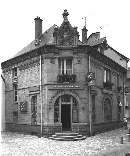 La conception du bâtiment, présentant un sous-sol et un étage carré, a été réalisée de manière à valoriser la travée centrale qui occupe un pan coupé et qui comporte, au rez-de-chaussée, l'entrée principale de la banque, précédée de trois degrés ; le couronnement de cette travée par un élément maçonné vertical à fronton triangulaire, mouluré et portant un décor sculpté, conforte ce parti pris. L'ensemble des trois élévations est rythmé par trois bandeaux, le bandeau supérieur souligné d'une frise de céramique et par une large corniche elle-même traitée avec des éléments en céramique et portant la date de construction : 1904. La partie basse des élévations, jusqu'au premier bandeau courant au niveau des allèges des baies du rez-de-chaussée, est traitée en appareil de revêtement irrégulier, alors que le reste est traité en pierre de taille.