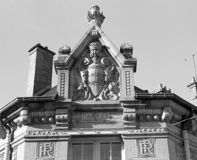 Armoiries de la ville de Felletin sculptées sur l'amortissement : d'or à trois fasces de gueules, celle du milieu chargée de trois feuilles de laurier d'argent. Initiales R F sculptées de part et d'autre de la fenêtre de la travée centrale. Feuilles de laurier sculptées de part et d'autre des armoiries et éléments végétaux sculptés sur les amortissements du support des armoiries et sur la frise en céramique.