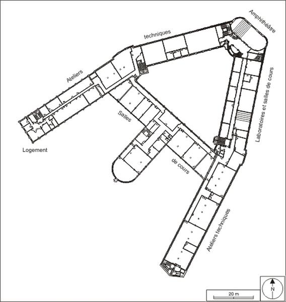 Très largement vitrés, les bâtiments ont des murs en béton armé : les plus anciens sont en pan de béton armé avec remplissage en maçonnerie de moellons calcaires et enduit partiel. Les moellons calcaires sont aussi mis en oeuvre en parement aux angles de l'internat. La chaufferie occupe le sous-sol de l'entrée, qui a un entresol et 5 étages carrés (en comptant la salle de l'horloge) voire 6 avec le dôme de l'observatoire. L'aile sud (entre corps d'entrée et " traverse") et l'aile en retour de l'internat ont un étage de soubassement. Les bâtiments ont soit 5 étages carrés (corps occidental de l'internat) , soit 4 (ailes nord et sud, et aile en retour de l'internat) , 3 (traverse et partie orientale de la " cédille ") ou 2 (cédille et bâtiment Coste). Le troisième étage de la traverse et de la cédille est suspendu à une charpente métallique extérieure et ses murs sont revêtus d'un carrelage mural. Les toits, portés par une charpente en béton armé sur les ailes nord et sud, sont à longs pans et croupes (polygonale à l'extrémité méridionale de la cédille). Ils sont couverts de tuiles mécaniques, matériau synthétique (traverse) , béton ou cuivre (dôme). Les étages sont distribués par des ascenseurs et des escaliers tournants, placés à chaque extrémité des ailes nord et sud ainsi qu'à proximité de leur jonction avec la traverse. L'escalier d'honneur se développe dans une cage vitrée à l'arrière de l'entrée.