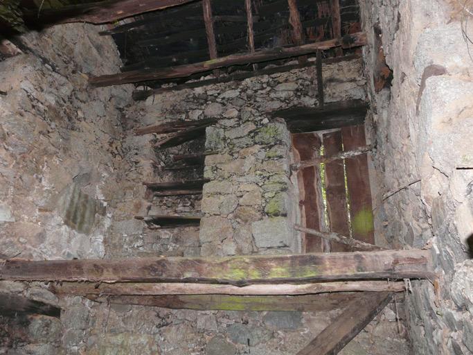 Bief à une arche conduisant l'eau de la rivière à une conduite forcée maçonnée. Ce moulin à farine était équipé à l'origine d'une roue hydraulique horizontale située en étage de soubassement voûté en berceau et actionnant alternativement le foulon ou la paire de meules en rez-de-chaussée surélevé, toujours visible parmi les vestiges. Le logement du meunier, juxtaposé au moulin, se compose d'un étage de soubassement permettant l'accès à la chambre des meules du moulin, et d'un rez-de-chaussée surélevé, équipé d'un placard mural, accessible de plain-pied grâce au dénivelé du terrain. Toit à longs pans couvrant le logement et appentis couvrant le moulin. Linteaux monolithes couvrant les baies. Linteau de la porte de l'étage de soubassement formé d'une demi meule en granite. Pierres d'attente.