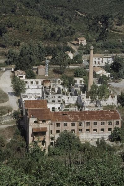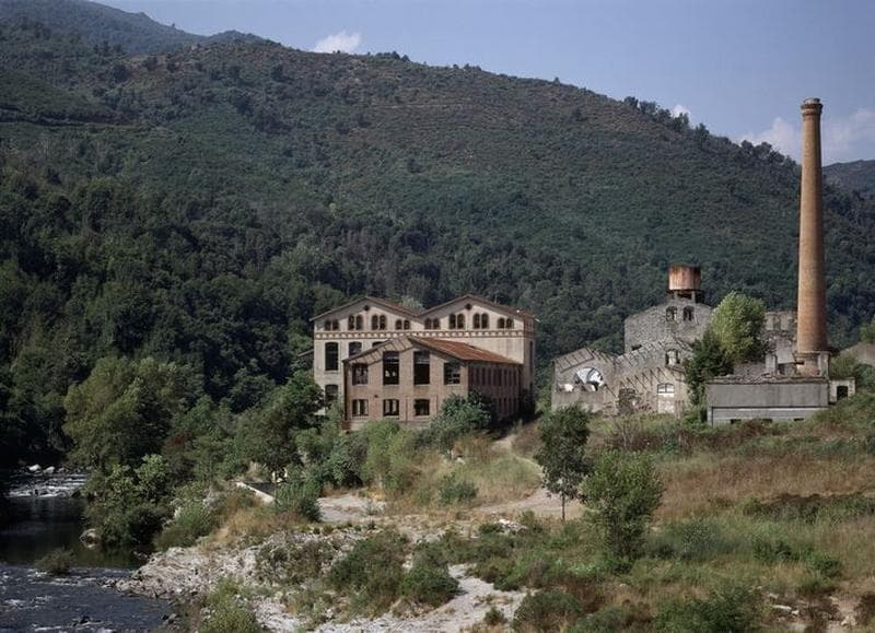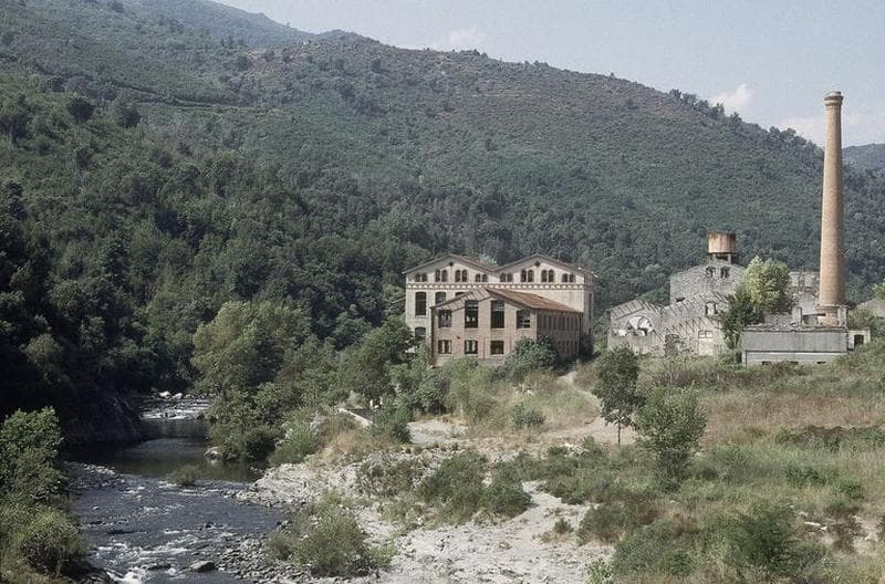 scierie ; tonnellerie ; usine de papeterie ; bassin de décantation ; bureau d'entreprise ; cheminée d'usine ; canal
