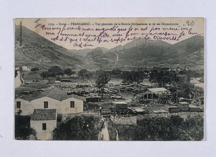 Au début du XXe siècle, l'entrepreneur Lucien Lucciani et l'ingénieur Vankiesdonk, originaire des Pays-Bas, implantent à Francardo une scierie hydraulique dite "scierie hollandaise". En 1906, ils s'associent avec Ferdinand Berthet, industriel des Arcs (Var) , fondateur de la "Société Berthet et Cie" et modernisent leurs installations. Quelque temps plus tard, les associés créent la "Société Agricole et Industrielle de la Corse" au capital de 375 000 F. La scierie, alimentée principalement par les exploitations forestières d'Aïtone et de Valdoniello, produit annuellement 2 000 à 3 000 m3 de bois sciés essentiellement destinés à l'exportation, 400 à 500 m3 étant réservés au marché local. Les entrepôts de Saint-Raphaël assurent la commercialisation de ces bois d'oeuvre. En 1911, L. Lucciani cède ses parts de la scierie aux industriels varois Ferdinand Berthet et Alphonse Giraud. En 1922, la capacité de production de la scierie, dirigée par Brevan, est augmentée grâce au perfectionnement des équipements hydrauliques. Dans les années 1930, l'établissement est repris par Antoine-Baptiste Lucciani, fils de Lucien, et le lillois Tiercelin. Ils se consacrent à la production de bois d'oeuvre, de lattes de rideaux, de manches à balais... En 1936, Antoine-Baptiste Lucciani est seul à la tête de cette scierie. En 1942, elle est réquisitionnée par l'armée italienne, puis de 1944 à 1945 par les forces alliées. En 1946, Antoine-Baptiste Lucciani associe ses deux fils Jean-Darius et Laurent à l'entreprise. A partir de 1947, l'activité de l'établissement s'accroît en raison de la demande européenne en bois d'oeuvre liée à la reconstruction de l'après-guerre, principalement en traverses de chemin de fer. L'essentiel de la production est exportée vers l'Angleterre et l'Allemagne. Pendant une dizaine d'années, la scierie connaît un vif essor : elle emploie 22 ouvriers alors qu'une quinzaine de personnes travaillent dans les forêts d'Aïtone et de Valdoniello pour approvisionner l'usine. En 1955, l'établissement est à nouveau modernisé. Toutefois, l'activité est en déclin. En 1975, un incendie détruit les installations. L'établissement est remis en état par Jean-Darius Lucciani mais la production demeure faible. Il ferme ses portes en 1985. Le site de la scierie hollandaise est aujourd'hui occupé par une entreprise de travaux publics.