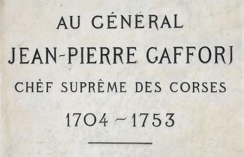 Ce monument commémoratif du général de la Nation Gaffori a été érigé en 1900 et inauguré solennellement le 23 décembre de la même année. Né à Corte en 1704, Jean-Pierre Gaffori, de son nom de baptême Ghjuvan Petru Gafforj, fut le chef de l'opposition à Gênes. Devenu général de la Nation en 1751, il est assassiné en novembre 1753. La statue, due au sculpteur Emile Aldebert (1828-1924) a été fondue par Thiébaut frères, comme le font apparaître les mentions portées sur sa base.