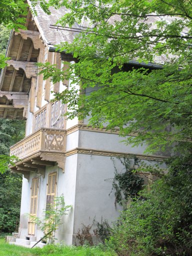 Le chalet est construit en retrait de la route, sur une petite éminence qui lui offre du dégagement. Il suit une orientation est-ouest, sa façade sur pignon étant orientée vers l'est, du côté de l'allée d'Etigny. A l'arrière, une petite aile forme un retour vers le nord. La façade est organisée de façon symétrique : deux portes-fenêtres au rez-de-chaussée, deux larges baies divisées par des meneaux en bois à l'étage et deux petites baies à un seul meneau au comble. Un large balcon en bois réunit les baies de l'étage. La façade est scandée horizontalement et verticalement : les extrémités du garde-corps se poursuivent en deux bandeaux qui ceinturent l'édifice et auxquels font écho trois bandeaux qui séparent les différentes parties du pignon. Les aisseliers se poursuivent sur le droit du mur jusqu'au sommet de l'étage, scandant verticalement l'édifice. La partie supérieure du pignon est peinte et divisée en deux registres : les initiales S S sont surmontées de la date 1848.£L'élévation sud a perdu l'escalier droit en bois qui longeait la façade et aboutissait au balcon en bois toujours en place. Celui-ci mène à une porte fenêtre, encadrée de trois autres baies de même gabarit. Une large baie à trois meneaux, identique à celles de la façade vient compléter ces ouvertures. Un balcon donne sur l'étage de l'aile nord tout en communiquant par une porte-fenêtre avec le corps principal.£Les grandes baies à meneaux multiples sont découpées en octogones encadrés par des petits carreaux de forme rectangulaire. Les bordures des octogones sont teintes en diverses couleurs. Les baies du comble ont quant à elle une vitrerie composée de petits losanges et bordés de petits carreaux carrés et rectangulaires multicolores.