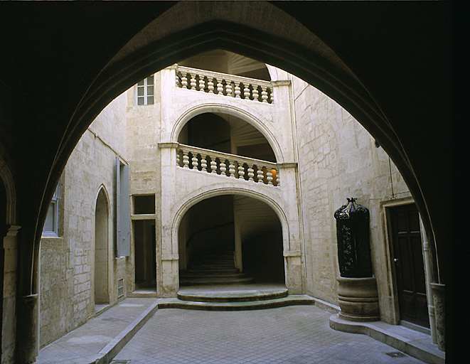 maison médiévale en quadrilatère sur cour ayant gardé son passage d'entrée, sa loge à deux travées, le plafond peint d'une grand-salle et les restes de décoration peinte d'une autre salle. Redistribution à la moderne au 17e siècle et création de la vis ouverte.