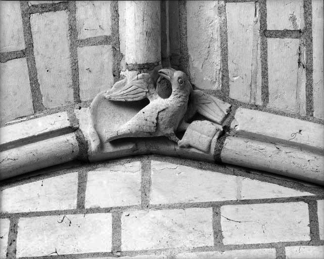 Chapiteaux à feuillages et chapiteaux à crochets dans la nef. Clés de la voûte du bras sud du transept représentant le Christ et les symboles des Evangélistes.