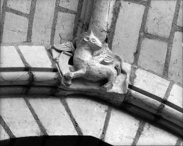 ornement à forme végétale ; ornement à forme géométrique ; crochet ; symbole : vie religieuse ; aigle de saint Jean ; boeuf de saint Luc ; Homme de saint Matthieu ; lion de saint Marc