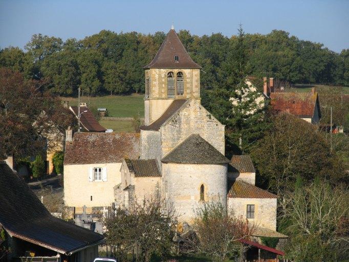 L'église se compose d'une abside de plan semi-circulaire et d'une nef unique sur laquelle ouvrent les deux chapelles ; le clocher carré est bâti sur l'extrémité ouest de la nef. La nef et l'abside sont construites en pierre de taille et en moellon équarris alors que les chapelles et le clocher sont en moellon de tout venant et sont enduits. Des vestiges de la bande d'enduit d'une litre funéraire subsistent sur l'abside et sur le mur nord de la nef, mais sont absents sur les chapelles, plus récentes.£Sur l'élévation sud de la nef apparaît un portail muré, couvert par un arc en plein cintre dont les claveaux portent la même marque lapidaire en forme de V. Au nord, des trous d'encastrement correspondent peut-être à un auvent qui aurait protégé l'étroite porte couverte en plein cintre aujourd'hui condamnée.£L'abside a conservé sa voûte en cul-de-four. La nef est couverte de deux croisées d'ogives, avec des arcs d'applique latéraux dans la travée orientale. L'élévation ouest de la nef conserve une petite porte couverte en plein cintre, formule que l'on retrouve dans plusieurs autres églises contemporaines du Lot.