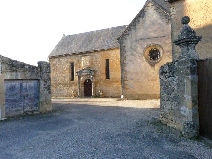 Au-dessus du portail, pierre neuve aux armoiries des Lauzières-Thémines : au 1 d'argent à l'osier de sinople (qui est de Lauzières), au 2 de gueules, à un lion lampassé d'argent, accompagné de besants du même, mis en orle (qui est de Cardaillac), au 3 de gueules à deux chèvres d'or passantes posées l'une sur l'autre, au 4 d'or à trois fasces de sable, au chef d'hermines (qui est de Clermont-Lodève).