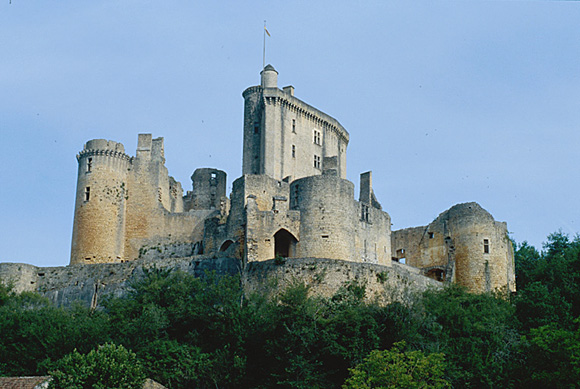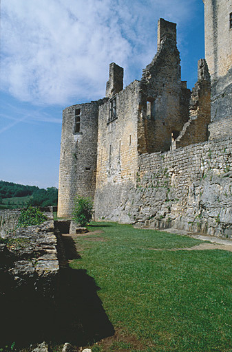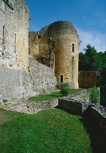 Système défensif limite 15e siècle 16e siècle : fortifications extérieures constituées d'un ensemble de courtines, poivrières et braies, associées à une barbacane au nord séparée de la cour d'honneur par un fossé. Esplanade protégée par une courtine basse formant fausse-braie dominée par le logis flanqué sur le front ouest d'une tour carrée accotée à la salle seigneuriale, encadrée par la grosse tour sur l'angle nord-ouest et par la tour rouge sur l'angle sud-est. Grosse tour de 4 niveaux surmontée de 2 étages de défense, le chemin de ronde inférieur étant supporté par des consoles en pyramide inversée. La cour d'honneur comprenant l'ancienne cuisine, est fermée à l'est par le donjon prolongé au sud en éperon suivant le profil du socle rocheux ; il surplombe les communs à l'est.£ Toit conique couvert en lauzes sur la guette du donjon. 2e niveau de la tour carrée et salles du donjon voutés d'ogives. Salle seigneuriale flanquée d'une tour d'escalier en vis hors-oeuvre. Escalier demi-hors-oeuvre sur l'angle sud-ouest du donjon. Escalier en vis dans-oeuvre dans la Grosse Tour.