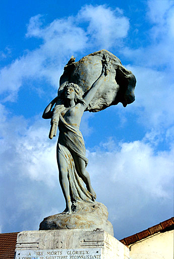 Décision du conseil municipal d'ériger un monument aux morts de la guerre 1914-1918 prise en 1921. Plan du socle dressé par l'architecte Gaston Rapin. Sculpture en fonte désignée "Victoire aux drapeaux" réalisée par Edouard Marcel Sandoz, sortie des fonderies et ateliers de construction du Val d'Osne. Travaux réalisés par E. Brousse, entrepreneur en maçonnerie. Grille de clôture réalisée par l'atelier de mécanique et de construction Edmond Blanchard et fils à Sauveterre, posée en 1925.