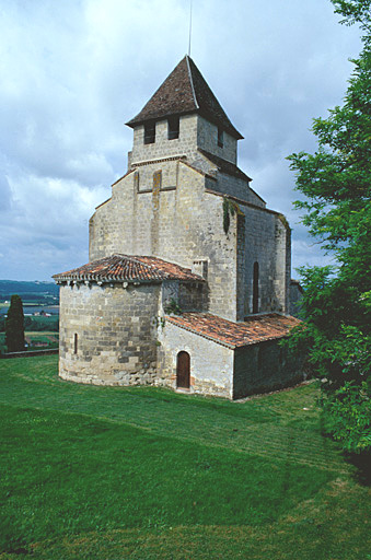 Eglise à coupole construite au 12e siècle, située au sommet du promontoire portant le château, isolé du village par un fossé. Elle est mentionnée comme prieuré de bénédictins en 1520, dépendant de l'abbaye de Clairac, donnée en 1604 par Henri IV à Saint-Jean-de-Latran. L'église faisait aussi office de chapelle castrale, la litre seigneuriale étant encore visible autour de la nef en 1734, comme l'atteste une description du curé de l'époque qui notait également que la voûte du choeur était "peinte de vieilles peintures et personnages avec des inscriptions en caractère gothique". l'ancien portail roman ouvrant au sud, réparé limite 15e 16e siècle, est probablement muré à l'occasion du percement du portail occidental et de la construction du porche en 1783 (date portée sur l'agrafe du portail et sur la clé de l'arc du porche). Clocher foudroyé en 1822 et réparé en 1823. Eglise restaurée par l'architecte agenais Albert Courau vers 1880 : enlèvement de l'enduit intérieur et suppression des boiseries du choeur.