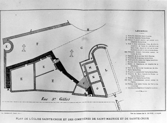 Entre 592 et 608, une chapelle est fondée par l'évêque saint Lézin sous le vocable de Sainte-Croix, en bordure d'une autre chapelle du nom de Saint-Etienne. Le second vocable de saint Etienne n'apparaît pas dans les sources avant la fin du 8e siècle. Sous l'épiscopat d'Ulger dans le 2e quart du 12e siècle, l'édifice est reconstruit comme église paroissiale. Elle conserve le double vocable jusqu'au 15e siècle. Celui de Sainte-Croix s'impose alors à la suite de dons faits à la paroisse de reliques de la vraie Croix. L'église est agrandie dans le 1er quart du 17e siècle, époque où serait construit un petit clocher. Puis elle est transformée entre 1701 et 1707 : le choeur, auparavant orienté, est alors aménagé à l'extrémité ouest de la nef. Le cimetière avait été créé en 1274 et reste commun avec la paroisse Saint-Maurice jusqu'en 1619. Il sera supprimé en 1791, parallèlement à la destruction de l'église. La fouille archéologique menée en juin 1996 lors du réaménagement de la place Sainte-Croix devrait permettre de préciser la connaissance de cet édifice.