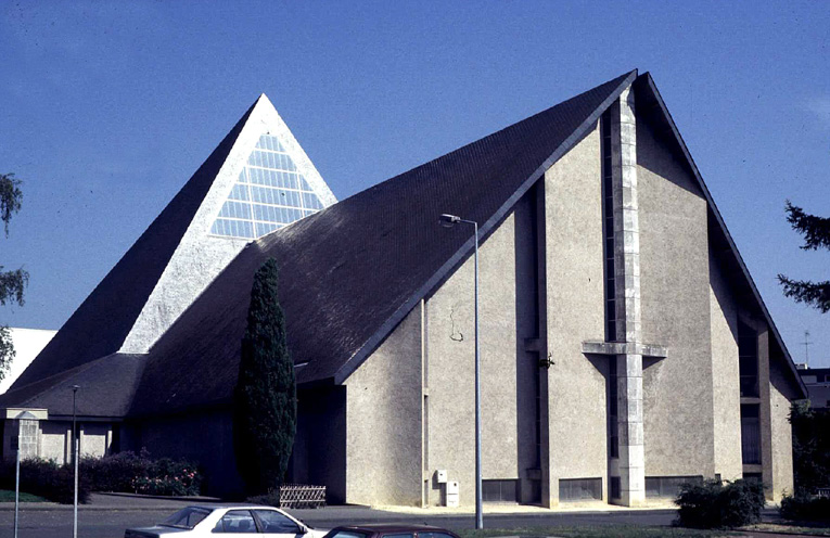 Unique exemple à Angers de l'architecture religieuse des années 1960, où l'humilité des chapelles de secours des années de reconstruction et de reconstitution du pays laisse place à des programmes plus ambitieux et monumentaux. L'église redevient une composante importante du quartier en création, ce que témoigne bien la volumétrie imposante tant du choeur pyramidal que des larges longs pans de la nef. Et la façade occidentale tout en verticalisme redevient dans le nouveau vocabulaire abstrait géométrique de l'art religieux une composition monumentale.