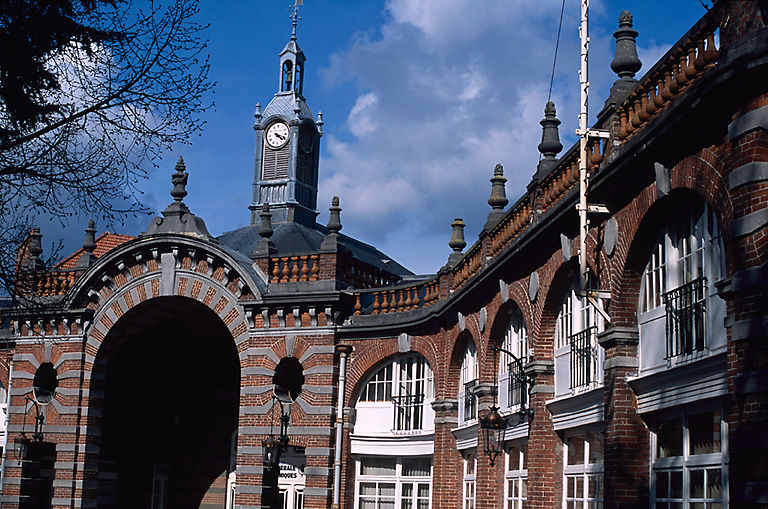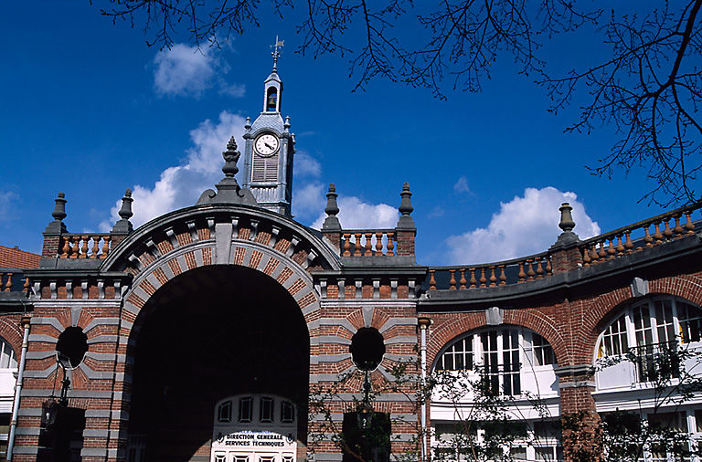 Parties constituantes : les écuries occupent l'angle formé par les rues de Reims (anciennement rue du Pont) et rue Pupin ; prolongées, d'un côté, par les écuries suivies de l'orangerie et du pavillon du concierge ; de l'autre, par les remises. Les logements occupent l'étage de la remise et de la sellerie. A l'exception de l'orangerie, tous les locaux ont été transformés en bureaux administratifs de l'hôtel de ville dès 1920. L'écurie, la remise et la sellerie s'organisent selon un plan symétrique en V s'articulant sur un porche monumental ; l'orangerie et la conciergerie sont accolées à celui-ci selon un plan rectangulaire. L'orangerie occupe un rez-de-chaussée ; la conciergerie, l'écurie, la sellerie et la remise et un étage carré. Les murs sont construits en brique et pierre calcaire grise d'Ecaussines (Belgique) en lits alternés. Côté jardin, la façade de l'orangerie est en pan de fer et verre. Après 1920, les baies des remises sont comblées en brique et verre pour abriter des bureaux. La toiture est en terrasse sur l'orangerie, en pavillon sur la conciergerie, à longs pans à croupe sur la remise, la sellerie et l'écurie. La charpente en bois apparente de l'écurie intègre celle du lanternon de l'horloge.