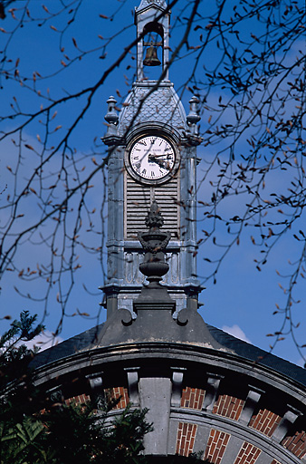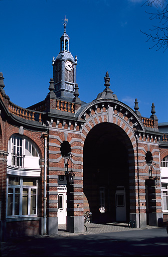 La façade dans l'angle est en hémicycle, avec, au centre, une grande loge voûtée et largement ouverte ; elle forme l'entrée couverte devant l'écurie et sert d'abri pour atteler, dételer, panser les chevaux. La corniche à consoles épouse l'arche monumentale du porche ; elle est surmontée d'une balustrade d'acrotère en terre cuite avec pots à feu d'amortissement en pierre et du lanternon de l'horloge.