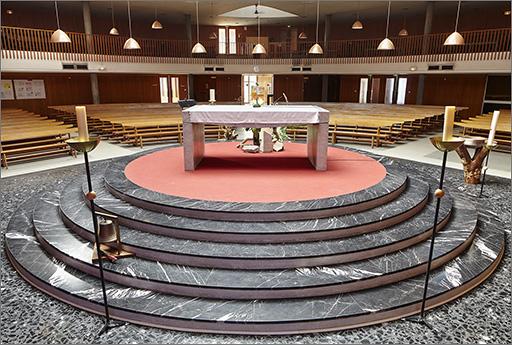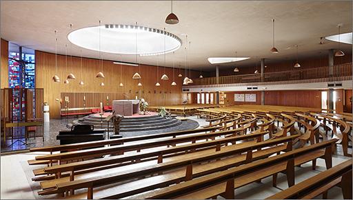 L'église comprend 2 niveaux, correspondant au dénivelé du terrain. Le rez-de-chaussée, précédé d'un préau au niveau de la rue, renferme les anciennes salles de catéchisme (aujourd'hui salles locatives pour banquets). L'étage est occupé par l'espace liturgique, la sacristie, la chapelle de semaine et le baptistère. On y accède par un escalier droit surmonté d'un auvent en béton, dans le prolongement d'une allée dont le départ se situe à l'angle de l'avenue de Boufflers et de la rue Eugène Corbin. Le plan est carré, la diagonale servant d'axe de symétrie entre chapelle des fonts et grande verrière disposées dans les angles opposées du carré. Les façades sont faites de panneaux d'aluminium, portées par une ossature en béton. Le bâtiment se veut discret, ayant pour seul marque, deux simples croix, l'une en bois posée sur le sol près de l'entrée, et l'autre en métal sur la toiture. Du plan carré, on passe, à l'intérieur, à un espace en forme d'amphithéâtre dont l'axe médian suite une des diagonales du carré. Sur cet axe, l'autel est rejeté dans un angle et placé en hauteur sur une plate-forme circulaire, en marbre veiné noir, surélevé de 5 marches. Les bancs sont disposés en demi-cercle sur un sol en pente descendant vers l'autel. Derrière les bancs s'ouvrent la sacristie, la chapelle de semaine, un espace servant de confessionnal mais dépourvu de tout meuble spécifique et au-dessus, une tribune permettant d'augmenter la capacité d'accueil. Dans l'axe de l'autel et de la verrière, l'espace réservé au baptême se développe sur deux niveaux, lui donnant une place privilégiée. Les murs sont recouverts d'un lambris en sapin, le plafond de plâtre blanc. L'éclairage est assuré par une coupole translucide placée à l'aplomb de l'autel et trois lanterneaux en forme de cône au-dessus de la tribune.