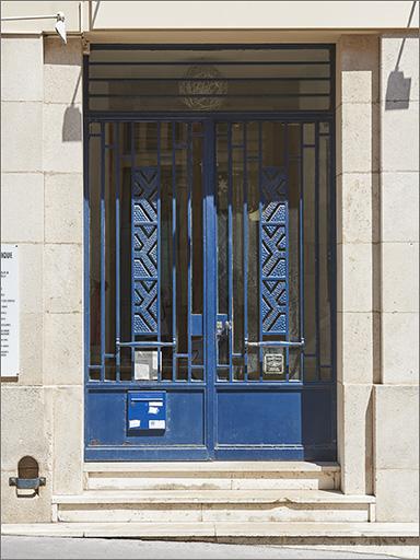 Immeuble à 5 niveaux couvert par une terrasse à 2 retraits successifs, de plan massé occupant la totalité de la parcelle pour le rez-de-chaussée puis de plan en U pour les étages autour d'une cour intérieure éclairant différentes pièces des appartements ; construction en béton armé (ossature, planchers, couverture), pierre de taille (façade principale) et remplissage de brique de laitier (élévations sur cour). L'élévation sur rue, de composition symétrique, compte 5 travées ; l'entrée de l'ancien entrepôt est centrée, une seconde porte à gauche donne accès à un vestibule précédant l'escalier menant aux étages (escalier tournant à jour dans lequel prend place un ascenseur) ; le rez-de-chaussée est largement ouvert par des fenêtres-vitrines et porte de garage, afin de répondre à la fonction commerciale du lieu, le 1er étage qui servait d'entrepôt est percé de larges baies rectangulaires (les 3 baies centrales étaient surmontées d'une enseigne au nom de l'entreprise). La composition est marquée aux extrémités par deux ressauts de plan polygonal en saillie sur le rez-de-chaussée, constituant une sorte de bow-window surmonté d'un balcon au 5e étage. Une corniche en forte saillie masque depuis la rue les terrasses successives. Le programme décoratif comprend ferronnerie et sculpture aux motifs géométriques de style Art déco. Portes d'entrée, portes palières d'ascenseur et garde-corps sont en métal martelé, repoussé et découpé de formes polygonales acérées. Le décor sculpté se concentre sous les bow-windows, les allèges (cannelures, denticules) et l'entablement supérieur. A l'intérieur, la cage d'escalier est éclairée par des vitraux géométriques et floraux (IM54014872), le revêtement de sol est en carreaux de mosaïque de forme irrégulière dessinant des arcs de cercles noirs ourlés d'un motif de dents de scie sur fond clair (blanc, gris, beige). L'appartement visité possède plafond mouluré à ressaut orné de motifs géométriques (dents de scie, arcs de cercle, godrons) et cheminée en marbre (IM54014875).