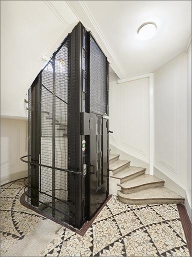 escalier dans-oeuvre : escalier tournant, en maçonnerie ; ascenseur