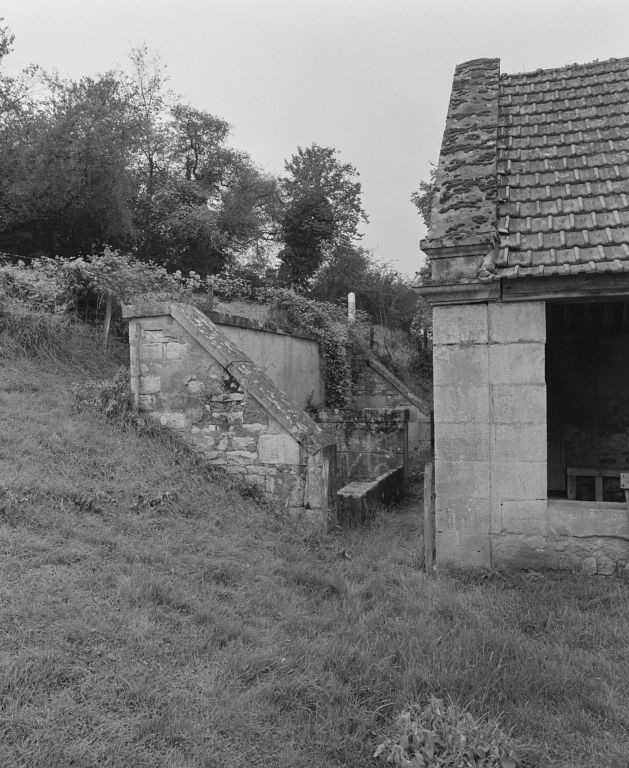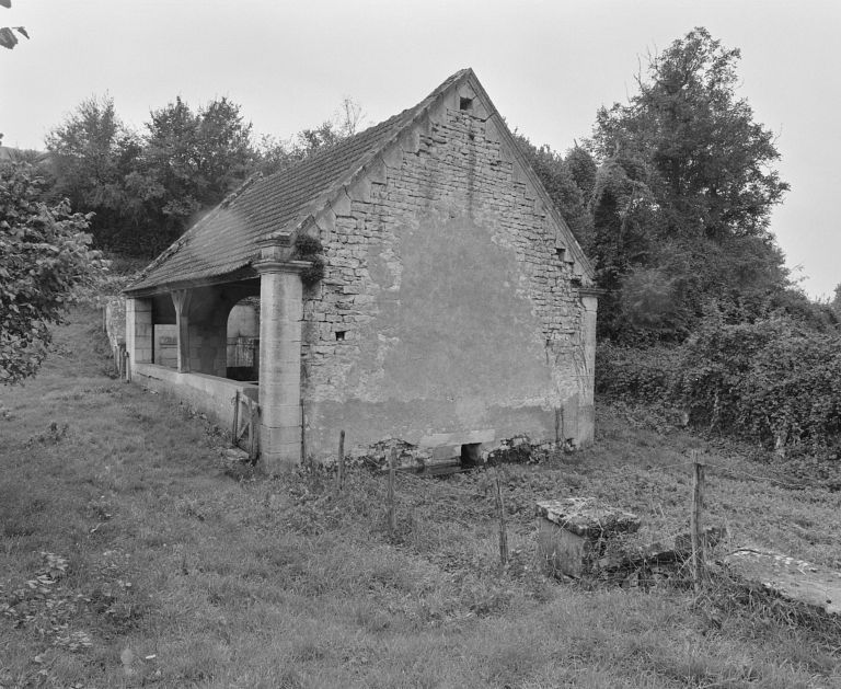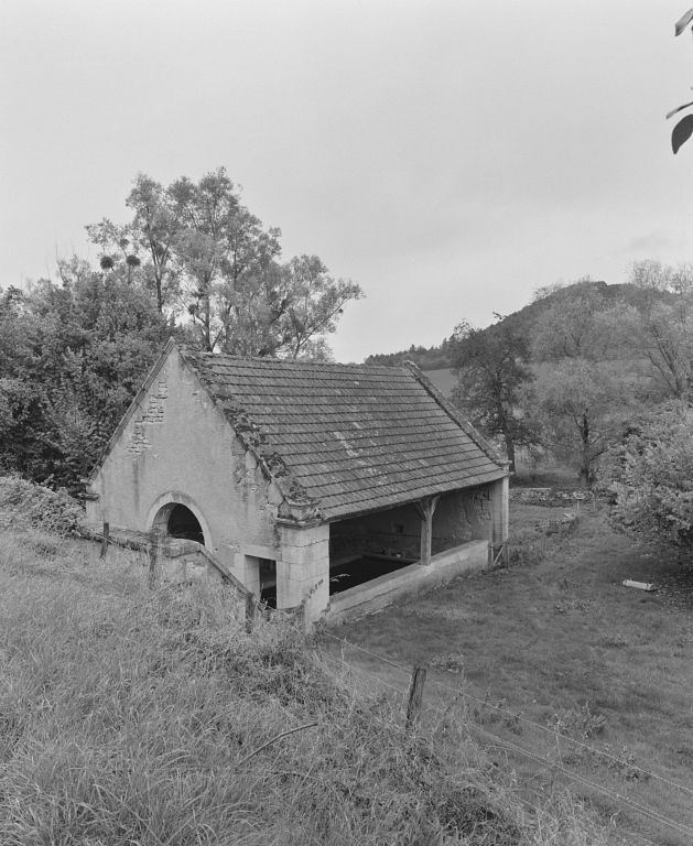 Lavoir situé au nord-ouest du village, en contrebas de la route ; bassin et abreuvoir alimentés par une source dont le trop-plein se jette dans le ruisseau des Fontaines ; édicule de captage adossé au talus de la route. Vaste abreuvoir dallé, de plan trapézoïdal, au droit du lavoir. Mur-pignon antérieur percé d'une haute arcade en plein-cintre accostée de deux portes d'entrée ; mur de long-pan et mur-pignon postérieurs aveugles. Charpente à une ferme contreventée. Rampants des pignons à crossettes et intrados en escalier. Banquettes et pierres à laver en pierre de taille, sol cimenté.