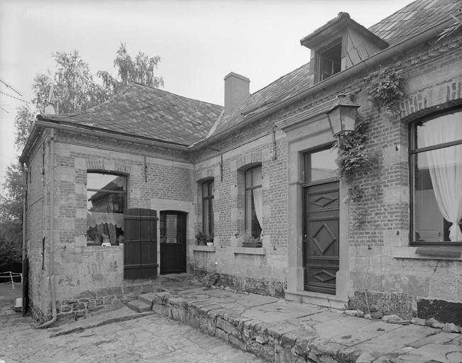 La maison est disposée selon un plan en L appelé également type marteau, perpendiculairement à la rue donnant sur une cour pavée. Les écuries sont disposées parallèlement au logis. La grange était située dans le prolongement des écuries. Le logis s'élève sur un seul niveau surélevé, en brique, sur un soubassement en pierre de taille. Les baies sont en anse de panier, encadrées par une chaîne discontinue de pierre et couronnées par un linteau continu, en pierre. La porte a un encadrement de pierre particulièrement soigné avec imitation de pilastre et entablement à losanges. La toiture est à deux pans sur le logis et à croupe sur l'aile en retour, qui abritait vraisemblablement une étable ou écurie. Il subsiste une porte basse avec un encadrement de pierre. Le logis est précédé d'un trottoir constitué de plaques de pierre.