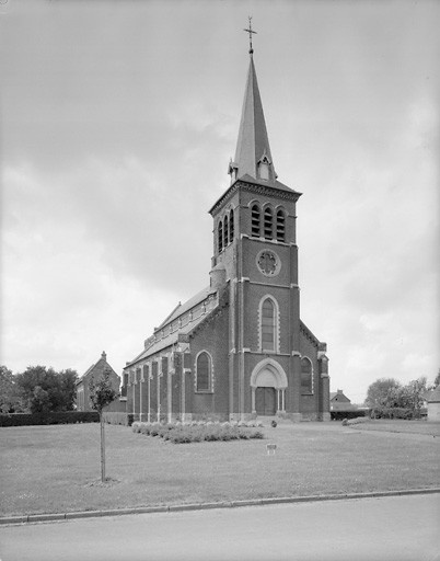 Eglise de style néo-gothique, à trois vaisseaux, un chevet à cinq pans et une tour-clocher. Les élévations sont en brique sur un soubassement de grès. Les ouvertures sont soulignées par l'emploi de pierre de Morley. Les fenêtres hautes ont des arcs brisés. Une rose éclaire la tour-clocher.