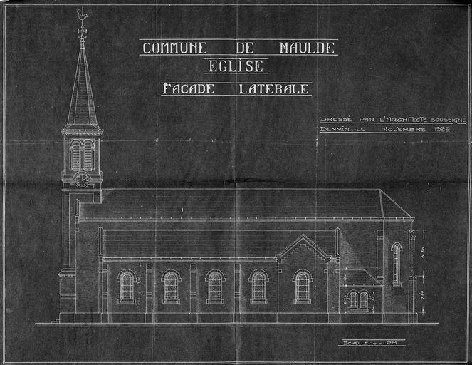 L'archéologue Pierre Leman situe l'église primitive hors de la terre abbatiale de Saint-Amand, dans le village de Don (disparu lors de l'aménagement de l'Escaut) appartenant à la seigneurie des princes de Ligne, proche de l'Escaut, comme le montre le plan terrier de 1665 (AD Nord, 12H109). L'évêque de Tournai donne l'autorisation de construire une autre église en 1506, édifié sur la hauteur, sur le territoire de la seigneurie de Saint-Amand, en bordure de la route de Maulde à Tournai. Ces deux édifices sont représentés sur les Albums de Croy. £En 1665 est demandé le transfert du siège de la communauté sur la colline, l'église est reconstruite au même endroit en 1751. £Celle-ci est restaurée en 1817 (AD Nord série O 397/32) par l'architecte Deleau, en 1899 par l'architecte valenciennois Louis Dutouquet (AD Nord, série O 397/34) et en 1904 par l'architecte valenciennois Henri Armbruster (AD Nord série O 397/41). £Après la Première Guerre mondiale, l'église paroissiale est reconstruite au même endroit que la précédente d'après le projet de 1923 (AD Nord série O 397/94) des architectes Louis Camus et Alfred Marsang, de Denain, successeurs de l'architecte Goris. L'architecte G.G. Trannoy, leur associé, dessine le projet des vitraux en 1926, qui sont réalisés par Vilmant et Laurent, décorateur-verrier installé à Lambersart (59).