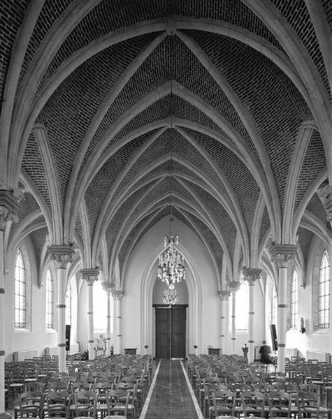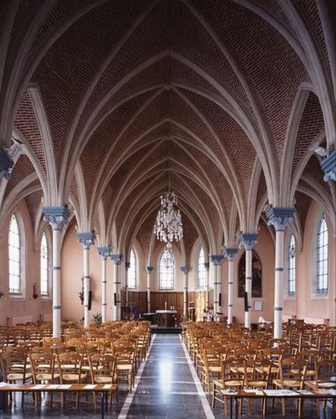 Le plan rectangulaire à 3 vaisseaux et 5 travées, adjoint d'une abside semi-circulaire, est précédé d'une tour de plan carrée peu saillante. Celle-ci est en brique, avec des contreforts en pierre blanche d'Avesnes-le-Sec (Nord) , un portail couronné d'une ogive et d'une rosace de style néogothique. L'ensemble est en brique sur un soubassement de quelques assises en grès. Une toiture complexe de doubles bâtières entrecroisées en ardoise de Fumay couvre les bas-côtés. La nef et les bas-côtés sont couverts de voûtes d'ogives bombées retombant sur des colonnes en fonte, creuses, particularité très novatrice pour l'époque - rappelons la première utilisation de la fonte par Boileau dans l'église Saint-Eugène à Paris, en 1854-55 - et la région. La chaire a disparu et semble avoir été partiellement réutilisée pour l'autel. L'église conserve quatre statues de plâtre de saint Louis Gonzague, saint Dominique, saint François d'Assise, saint Antoine de Padoue et le vaisseau sud accueille une Nativité (1861) de Félix Dumortier (1801 Tournai - 1868 Bruxelles).£Il s'agit vraisemblablement d'une des premières oeuvres de l'architecte valenciennois Louis Dutouquet, très actif ensuite dans la région.£Le cimetière est situé sur le flanc nord-ouest.