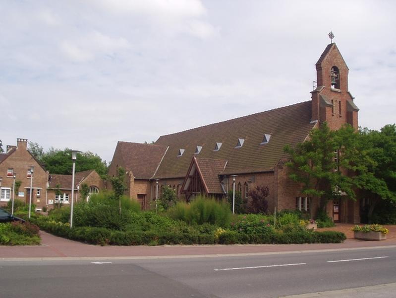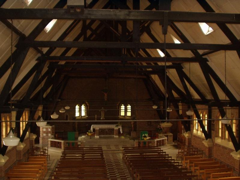 L'église reconstruite après la Seconde Guerre mondiale présente un caractère régional par l'utilisation de la brique et de la tuile, sa silhouette au toit à deux fortes pentes et son clocher porche.