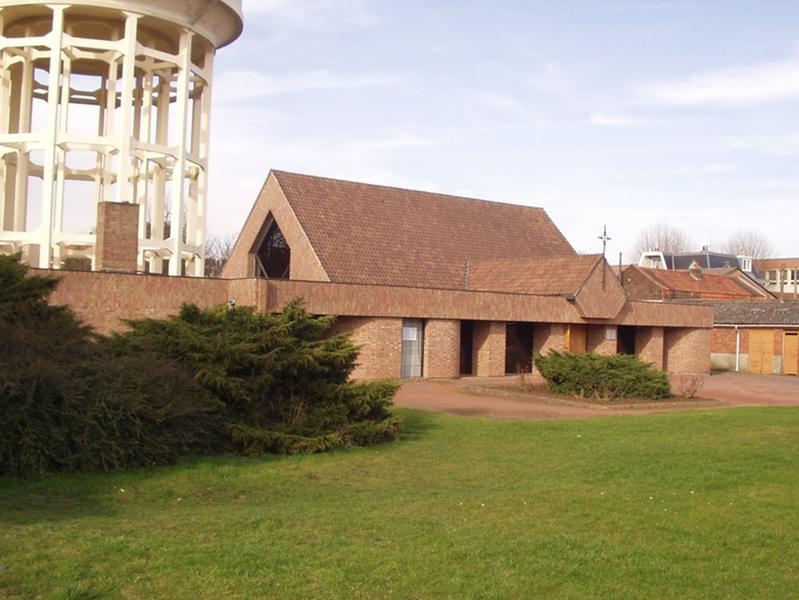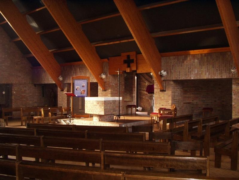 L'église en brique comprend un narthex, un vaisseau et une salle de réunion. Le narthex permet au besoin d'agrandir le vaisseau. Ce dernier, plus large que long, est aménagé de façon à rassembler les fidèles autour de l'autel. Les bancs sont en effet disposés en arc de cercle autour de l'autel situé au milieu d'un des longs côtés de la nef.
