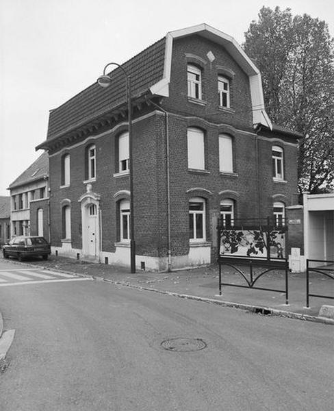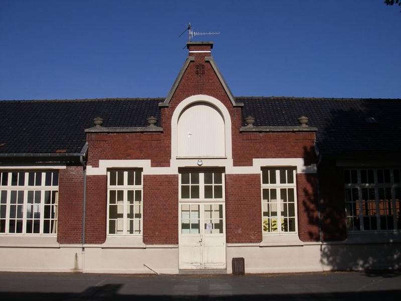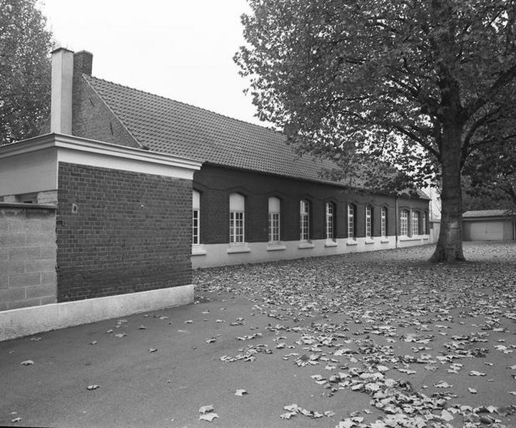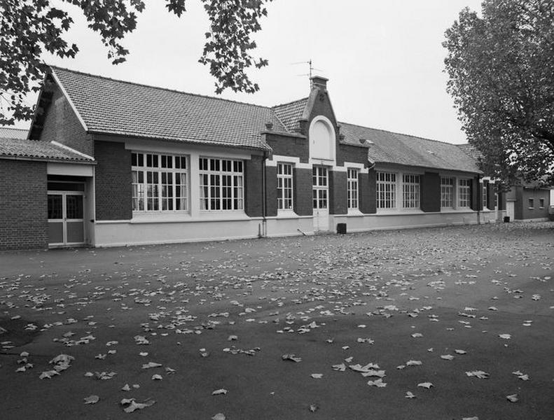 Ce bâtiment rectangulaire est situé perpendiculairement à la rue et en retrait, disposition issue de son implantation à l'origine à l'arrière du vieux presbytère. Il est en brique et couvert d'un toit à longs pans en tuile mécanique remplaçant la panne originelle. Les murs gouttereaux sont percés d'ouvertures couvertes d'arc en bâtière. Celui côté cour possède une modénature décorative en brique saillante ; l'autre côté, donnant à l'origine sur les pâtures présente un décor simplifié. Une extension, prolongeant de 3 travées sur l'arrière le bâtiment d'origine, reprend le même vocabulaire décoratif ; la largeur des ouvertures y est cependant fortement accrue. Le soubassement avec appuis ébrasés des fenêtres en ciment sont probablement refaits à l'identique lors de la construction du bâtiment des classes de garçons. L'implantation de la maison des institutrices a été conditionnée par celle du vieux presbytère qu'elle a remplacé. Bien que réaffectée depuis, elle conserve, dans l'ensemble, les dispositions souhaitées par l'architecte : un volume principal doublé d'un volume annexe sur l'arrière, organisant une double distribution par le logement de la directrice et son accés en façade principale, sur la Place ; et celui des adjointes avec son entrée donnant sur la cour d'école.£Le volume principal présente un étage carré et niveau de comble habité, est couvert d'un toit débordant à longs pans brisés et demi-croupes en tuile mécanique dont la particularité est d'offrir un brisis quasi vertical, interrompu par un égout retroussé sur corbeaux de bois ouvragés. Les 3 lucarnes prévues par l'architecte semblent avoir été supprimées au cours de la réfection de la toiture. L'aile réservée aux adjointes offre un étage couvert d'un long versant, interrompant le brisis et prolongeant le versant du volume principal.£L'utilisation de la brique et du décor en enduit ciment imitation pierre harmonise les 4 façades percées de baies en arc segmentaire. Les ouvertures du rez-de-chaussée sont surmontées d'un larmier mouluré ; celle de l'étage d'un cordon-larmier courant sur l'ensemble des façades.£La porte principale fait l'objet d'un traitement décoratif soigné, inspiré de l'architecture régionale du 17e siècle, réalisé en ciment imitant parfaitement la pierre : elle est encadrée d'un chambranle mouluré à crossettes et clef saillante surmonté d'un fronton-larmier curviligne orné en son sommet d'un disque mouluré. La façade principale de la maison du directeur, donnant sur la Place, présente trois travées, un étage carré et est couverte d'un toit à longs pans et demi-croupe débordante en tuile emaillée noire, éclairé sur l'avant par une lucarne-pignon. La maçonnerie de brique est associée au ciment et béton armé (appuis, balcon, blocs sommiers des linteaux de l'étage, linteaux droits à chanfreins (formant bandeau continu) des ouvertures du rez-de-chaussée) et à la brique grise (linteau - bandeau de fenêtres de l'étage). Un balcon en fer forgé sobrement ouvragé surmonte la porte d'entrée. Le bâtiment de classes de garçons est implanté en retrait de la chaussée, parallèlement à celui des filles, composé de 3 classes.£Ce long corps de bâti en rez-de-chaussée est couvert d'une toiture formée de deux longs pans interrompus par les toitures transversales de deux lucarnes-pignons, en tuile mécanique émaillée noire.£En dépit de sa régularité formelle, la façade sur cour, stylistiquement proche du logement du directeur, ne présente pas de symétrie ; elle est percée de larges ouvertures séparé par des poteaux et couvertes de linteaux droits chanfreinés en béton armé. Les deux portes, non centrées, sont surmontées d'une baie en plein-cintre logées dans une lucarne-pignon dont le style évoque l'architecture néo-flamande en vogue à cette époque. Les deux cours sont fermées par les préaux constitués de poteaux et larges poutres/linteaux en béton armé et couverts de tôles ondulées.
