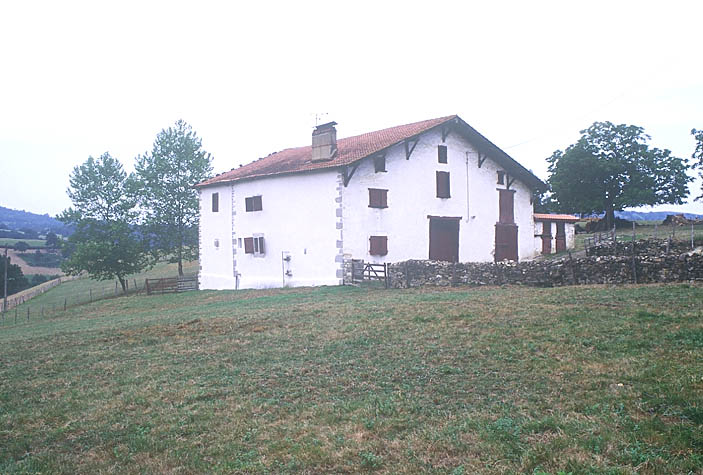 logis indépendant avec dépendances dispersées,logis indépendant avec dépendances adossées sur l'arrière,ferme en corps de bâtiment unique rectangulaire avec accès sous le gouttereau au logis, grange et étable,ferme en corps de bâtiment unique tripartite devant avec ezkaratz au centre, étable sur l'arrière et fenil au-dessus