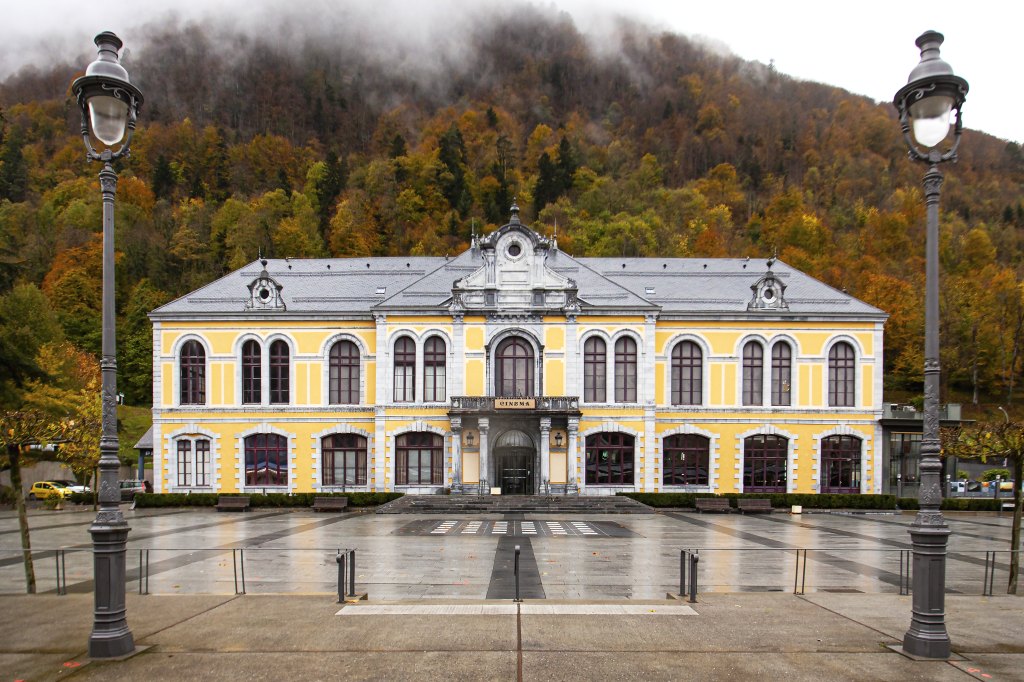 Au pied de la montagne et non loin du gave, le vaste édifice déploie à partir d'un plan rectangulaire, presque palladien, de longues élévations de neuf travées. Ses façades ordonnancées, ses dispositions et ses références associant citations baroques et classiques renvoient au modèle de l'éclectisme des Beaux-arts prôné dans la seconde moitié du 19e siècle. Sa façade principale comptant vingt-quatre baies parfois géminées se décompose en trois divisions de trois travées chacune.£Alors que les décors adoptent globalement la sobriété du néoclassicisme qui mêle ici un enduit jaune (non originel) et une modénature en pierre de taille grise, l'ornementation riche est exclusivement concentrée sur la division centrale de la façade d'entrée qui se compose d'un perron, d'un porche supporté par quatre colonnes à l'antique et d'un fronton sculpté de style baroque. Les baies du rez-de-chaussée constituées d'arcs surbaissés se réfèrent à l'architecture urbaine contemporaine tandis que celles du premier étage empruntent au néoclassicisme leur forme d'arc en plein-cintre et que la toiture est agrémentée de quatre lucarnes baroques réparties sur les façades principale et latérale. Comme la plupart des bâtiments des stations thermales pyrénéennes, cet édifice aux références nationales voire internationales est bâti à partir de matériaux et procédés constructifs vernaculaires, en particulier le marbre gris des élévations et l'ardoise de la couverture, auxquels il faut ajouter des matériaux et techniques modernes comme la structure métallique de la véranda de la façade nord.£A l'intérieur, les espaces du cinéma (autrefois casino) et de la piscine municipale (auparavant thermale) sont drastiquement séparés, les entrées s'effectuant par deux façades différentes. Au fond du vestibule, l'escalier central en marbre, particulièrement intéressant, se compose d'une volée droite conduisant à un entresol d'où se déploie un escalier à double volée.