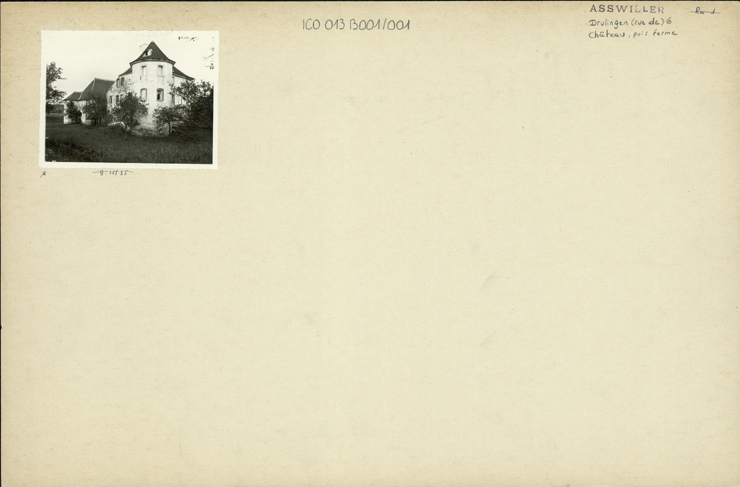 Château mentionné pour la première fois en 1212, en tant que possession des seigneurs d'Asswiller. Fief des comtes de Lutzelstein à partir du 13e siècle. Le château est rénové sous les Palatin-Deux-Ponts en 1561 et remplacé au 18e siècle par une nouvelle construction dont le bâtiment principal sera détruit en 1839. Deux ailes sont conservées dont l'une, celle de droite, porte la date de 1769 ; elles sont englobées dans une vaste exploitation agricole.