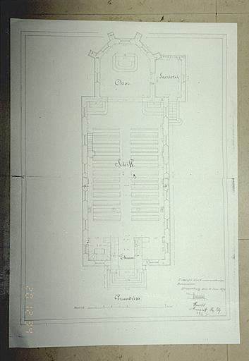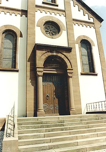 L'église est orientée ; elle présente un clocher-porche dans-oeuvre, percé d'une porte en plein cintre, flanquée de colonnes à chapiteaux cubiques. Sur l'arc, inscription en allemand : Es ist ein heiliger und heilsamer Gedanke fuer die Verstorbenen zu beten, 1874. Fenêtres en plein cintre ; au 2e niveau rose ajourée ; au dernier niveau baies jumelées en plein cintre, avec oculus aveugle. Flèche à 8 pans. Choeur épaulé par 6 contreforts. Décor de frises d'arceaux sur toutes les élévations. A l'intérieur, tribune reposant sur 3 arcs en plein cintre à chapiteaux cubiques ; garde-corps en grès, orné d'une arcature non ajourée. A l'est arc triomphal en plein cintre, choeur à pans coupés, voûté d'ogives, retombant sur des colonnes. La sacristie, qui avait été prévue au sud du choeur, a été construite contre le pan axial, présentant deux niveaux (porte en plein cintre au sous-sol, baies jumelées au rez-de-chaussée).