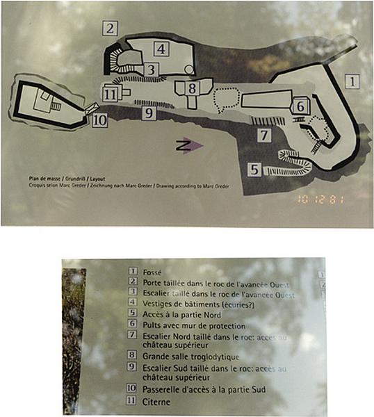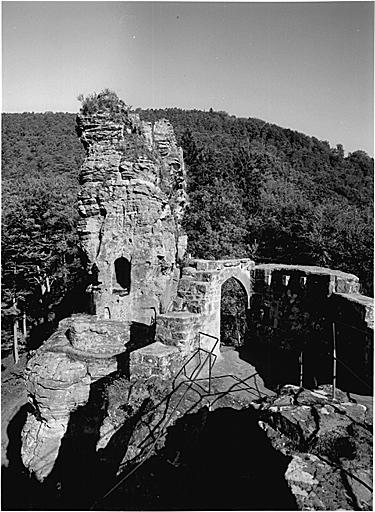 Le château fort, érigé au nord-ouest de Lembach, est isolé sur un éperon en grès orienté nord-sud, séparé de la montagne par un important fossé. L'éperon, coupé en deux parties, comporte un rocher nord plus long et plus haut que le rocher sud auquel il est relié par une passerelle moderne, au niveau intermédiaire du rocher nord. Ce dernier comporte à la base, côté nord - ouest, une salle basse taillée dans le rocher qui communique par une étroite baie (de date indéterminée) avec un réduit cylindrique taillé dans le rocher et aboutissant au niveau intermédiaire. Il pourrait correspondre à un ancien puits-citerne. Au-dessus de la porte de la salle basse sont visibles les traces d'ancrage d'un pont-levis (?). Plus loin, vers le sud, se situe une avancée ouest avec porte d'accès, escalier tournant taillé dans le grès, traces de dépendances avec écurie (?) , puits dans un angle et vestiges d'escaliers dans le rocher. Au niveau intermédiaire, côté est (auquel on accède, après un escalier moderne, par une porte dont subsiste un montant appareillé) se trouvent deux salles superposées taillées dans le rocher ; vers le nord se situe la partie supérieure de l'ancien puits-citerne (?) , vers le sud une citerne carrée près de la passerelle moderne qui donne accès au petit rocher sud. Celui-ci est entièrement occupé par les vestiges de la tour d'habitation dont subsiste la porte en arc brisé, datée de 1481. Les vestiges du donjon nord et du logis en enfilade vers le sud, situés sur la terrasse supérieure du rocher nord sont inaccessibles.
