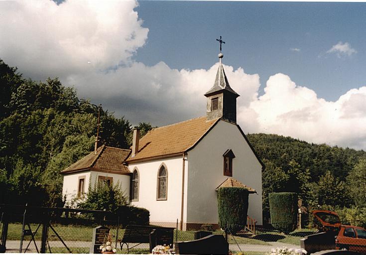 Chapelle non orientée, plafonnée, avec nef et choeur (au nord) à pans coupés. Fenêtres en arc brisé ; campanile sur le toit de la nef ; dans le pignon petite niche avec statuette. Sacristie latérale, côté ouest.