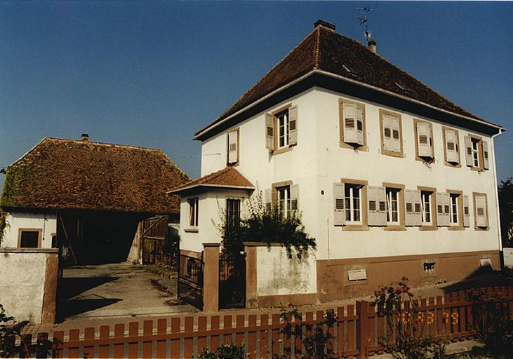 Bâtiment rectangulaire sous toit à croupes ; fenêtres rectangulaires. Sous-sol demi-enterré, rez-de-chaussée surélevé et un étage. Porte d'entrée cachée par une adjonction moderne. Au fond de la cour, grange avec étable sous toit à grandes demi-croupes et dépendance en équerre. Puits avec auge-abreuvoir.