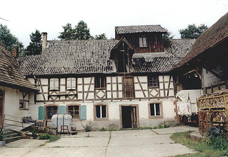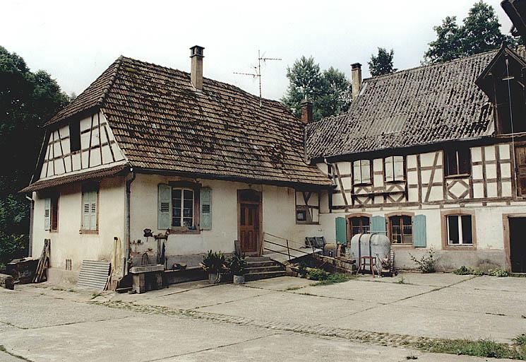 Logis en maçonnerie, en rez-de-chaussée, avec sous-sol partiel. Le moulin lui est accolé ; il comprend un rez-de-chaussée (une partie en contrebas) en maçonnerie et un étage en pan de bois. Linteaux des fenêtres en arc segmentaire ; losanges dans les allèges. Grande lucarne avec poulie. Grange et étable en maçonnerie et pan de bois (remaniées). Buanderie en bordure du canal. Puits avec margelle de grès.